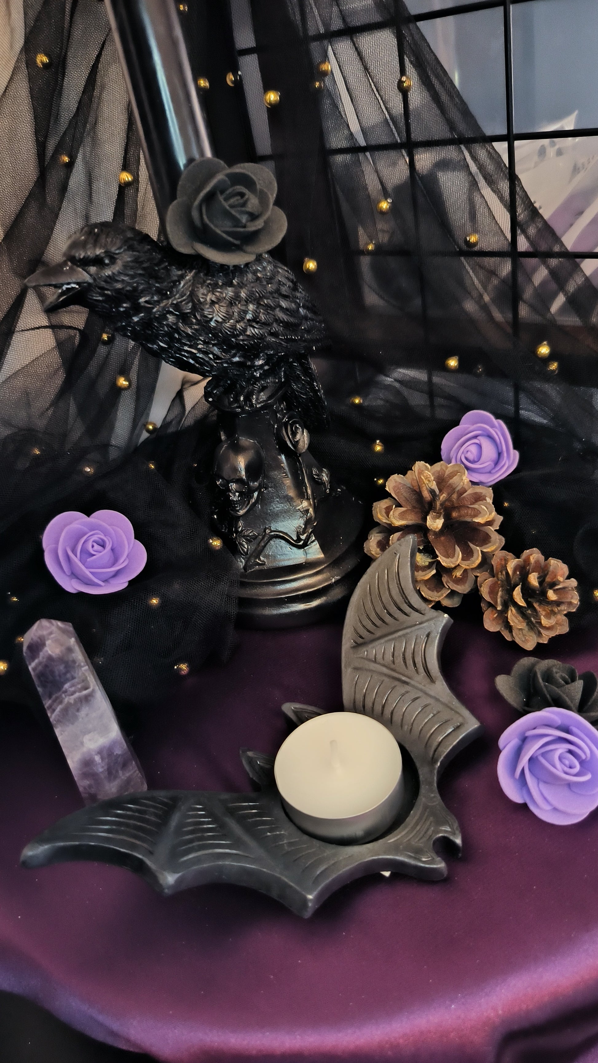 Un ajout parfait à votre décoration d’Halloween ou pour les amateurs de tout ce qui est effrayant, ce photophore en résine est à la fois élégant et mystérieux. Osez être vous-même jusqu'à dans votre décoration, en arborant ce motif de chauve-souris volante, avec des ailes complexes et une finition noir profond. Il ajoute une touche de gothique à n'importe quel espace ! Ce photophore peut accueillir une bougie chauffe-plat standard, projetant des ombres captivantes et créant une ambiance fascinante. Idéal pour mettre en valeur les espaces intérieurs modernes et éclectiques, c'est un choix parfait pour une soirée d'Halloween mémorable ou pour toute occasion où une atmosphère sombre et envoûtante est recherchée.