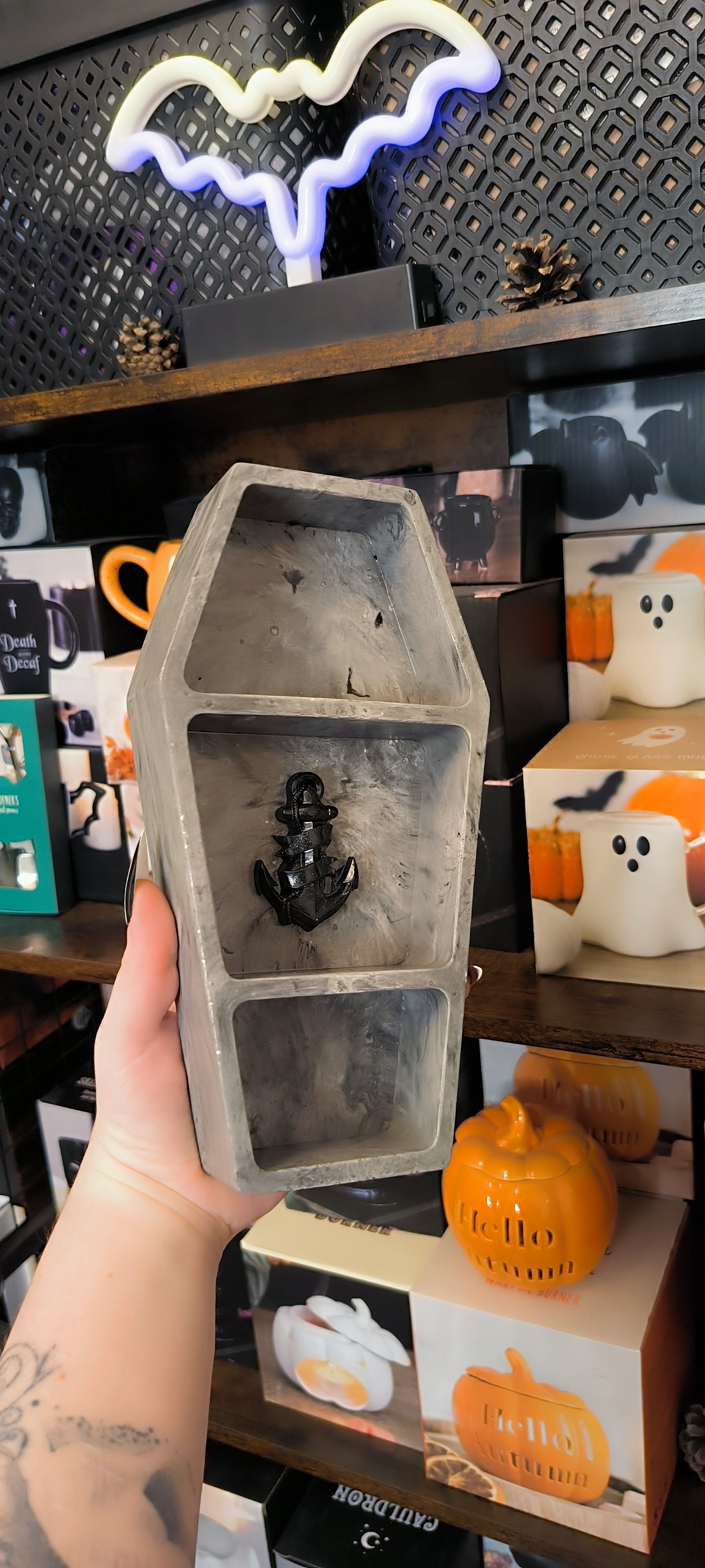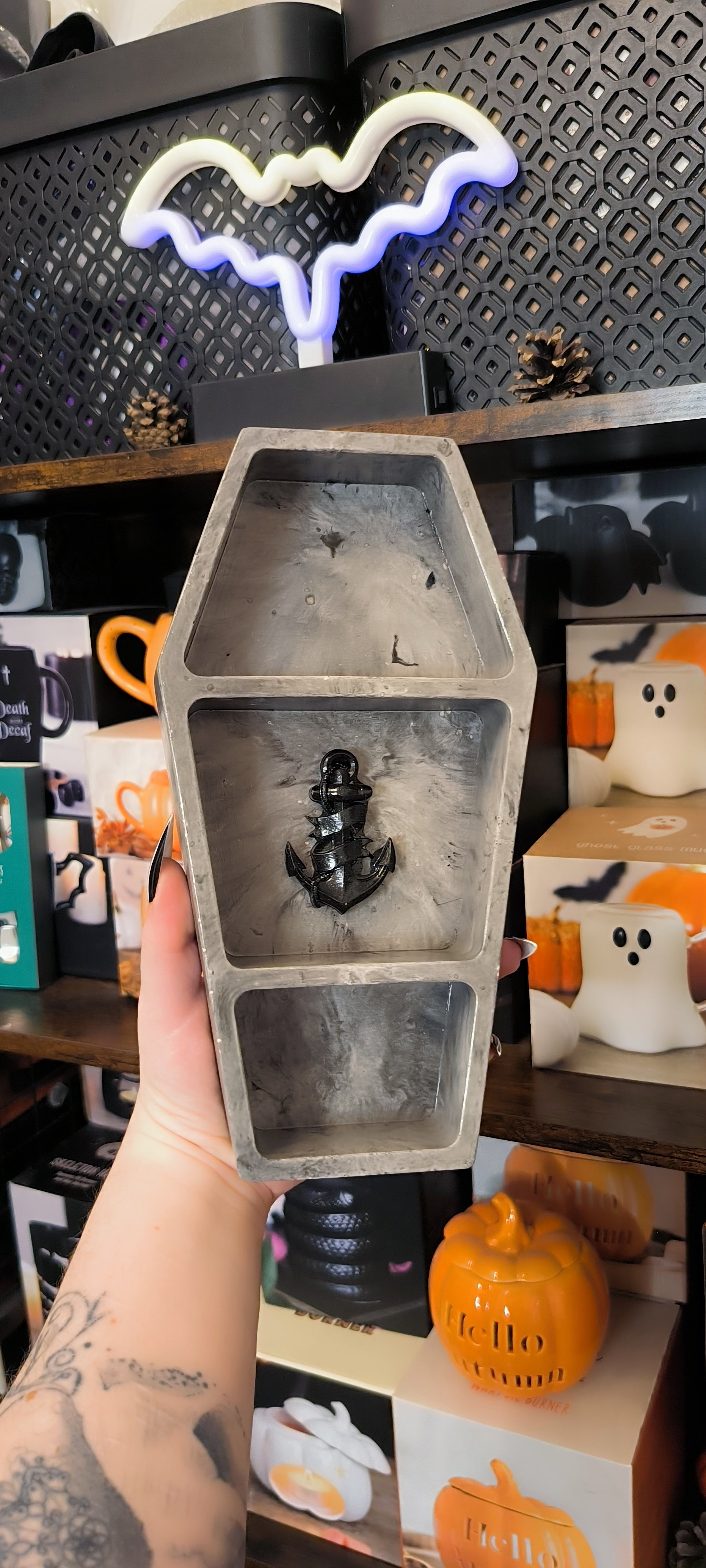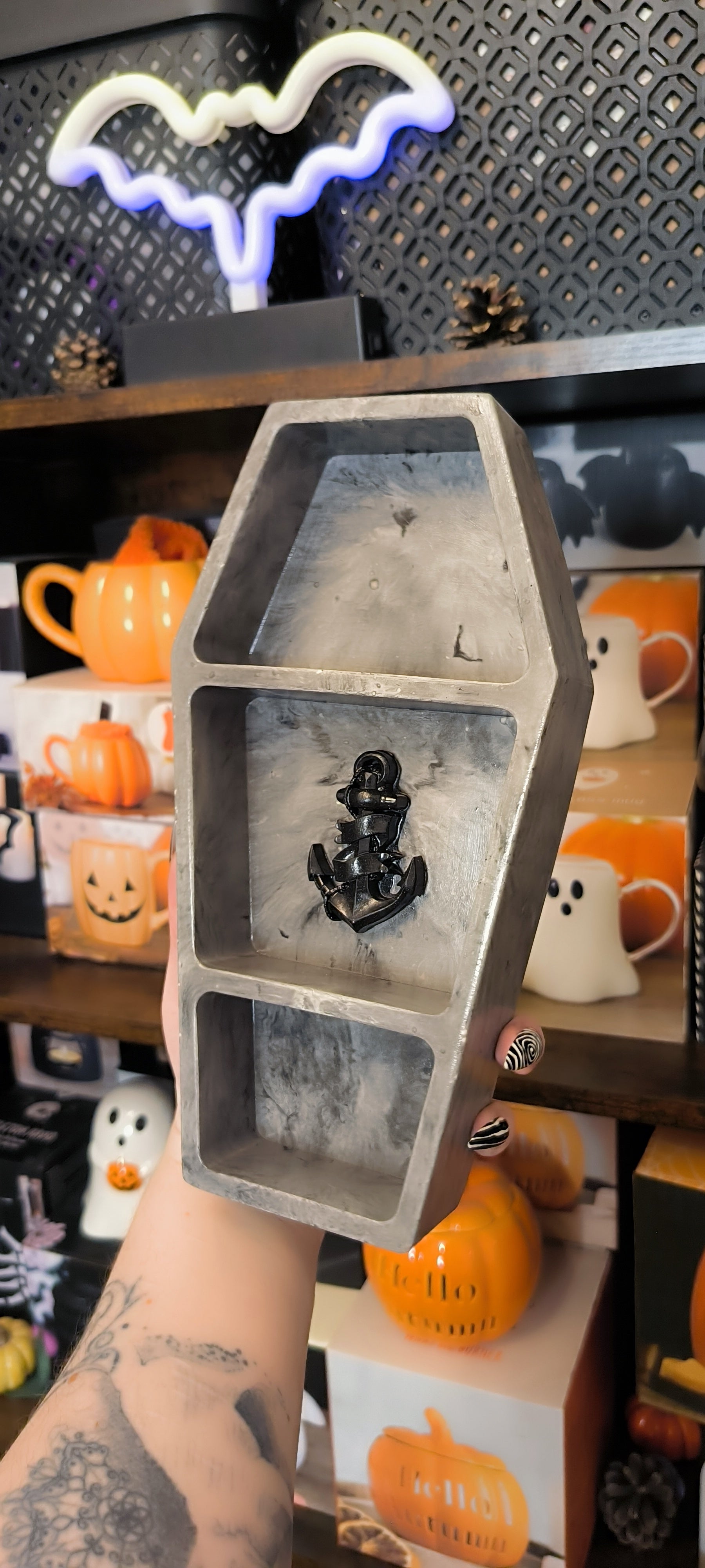 Objet à la fois symbolique et fonctionnel, ce cercueil en Jesmonite se distingue par son Ancre marine en relief qui est une invitation au voyage. Son design travaillé offre trois compartiments intégrés, parfaits pour ranger vos bijoux, accessoires ou petits objets précieux. Que ce soit en décoration sur un meuble ou en appui vertical, il s'impose comme une pièce forte et élégante, avec une touche old school bien rock'n roll !