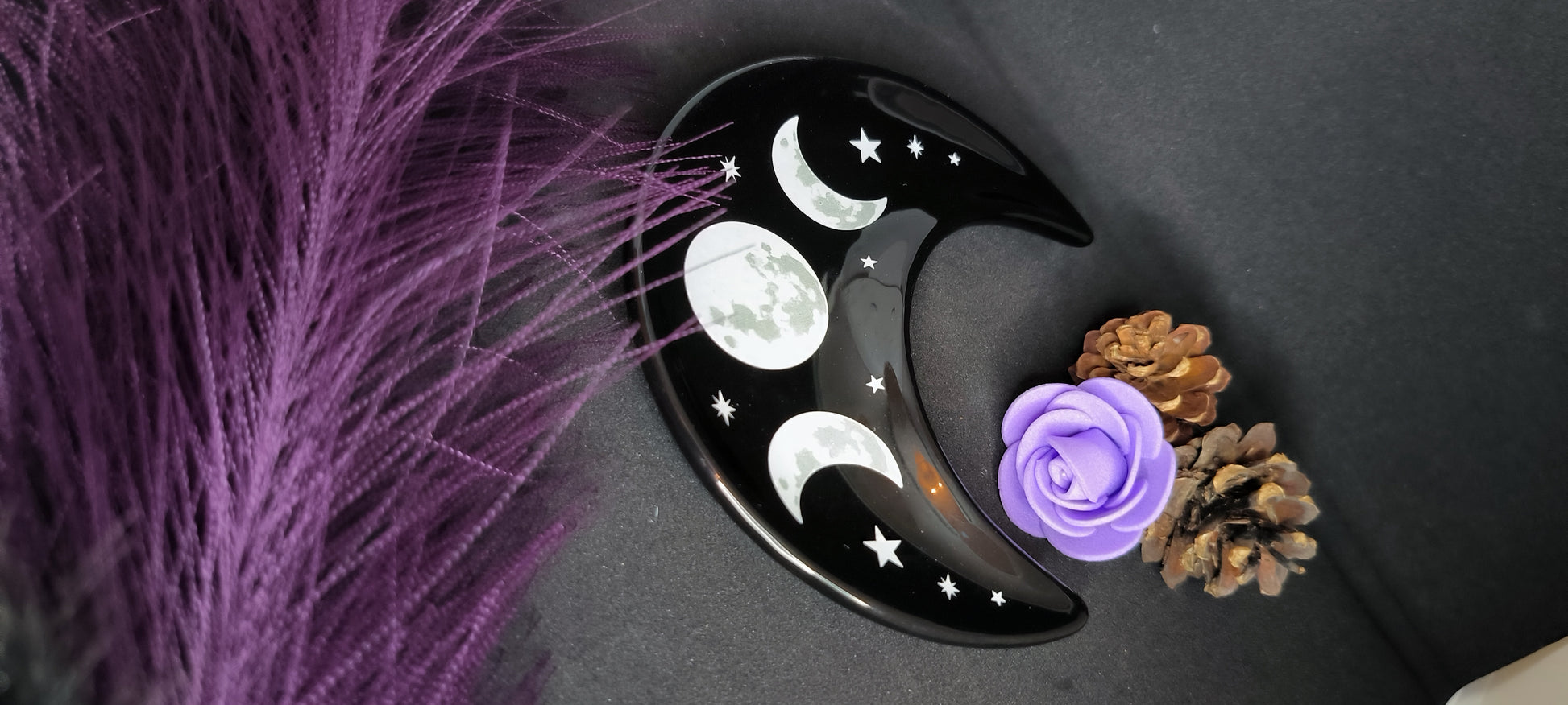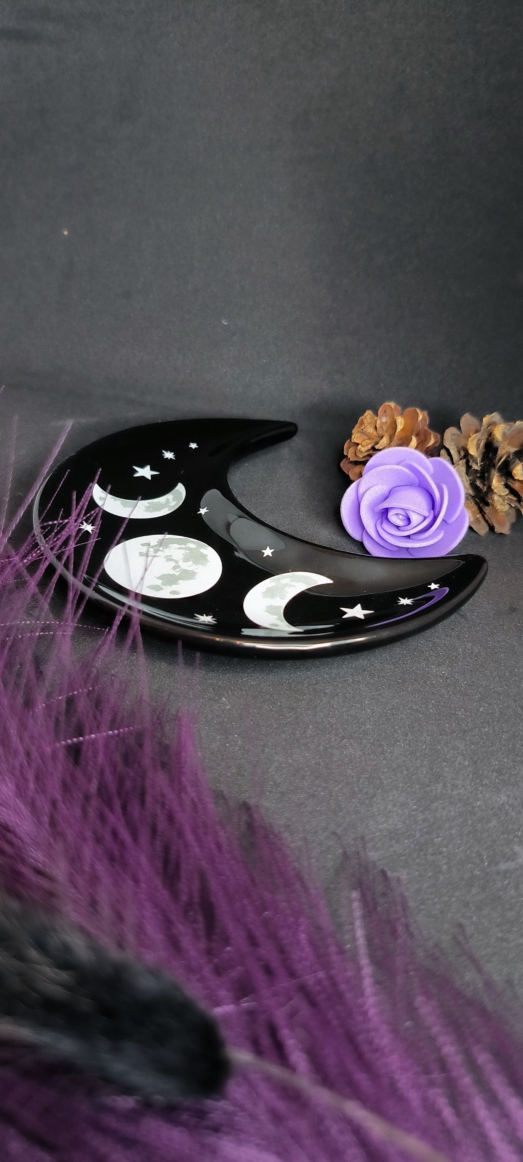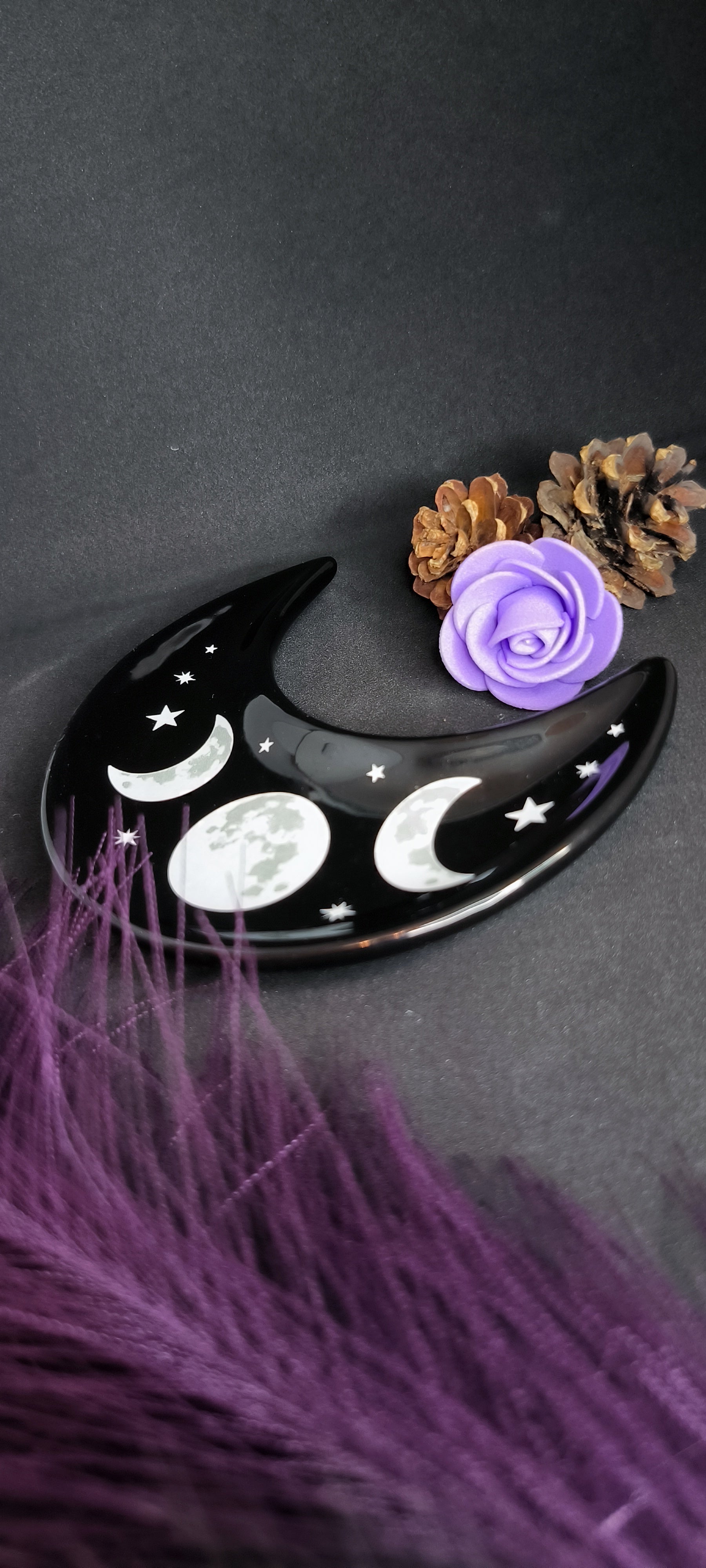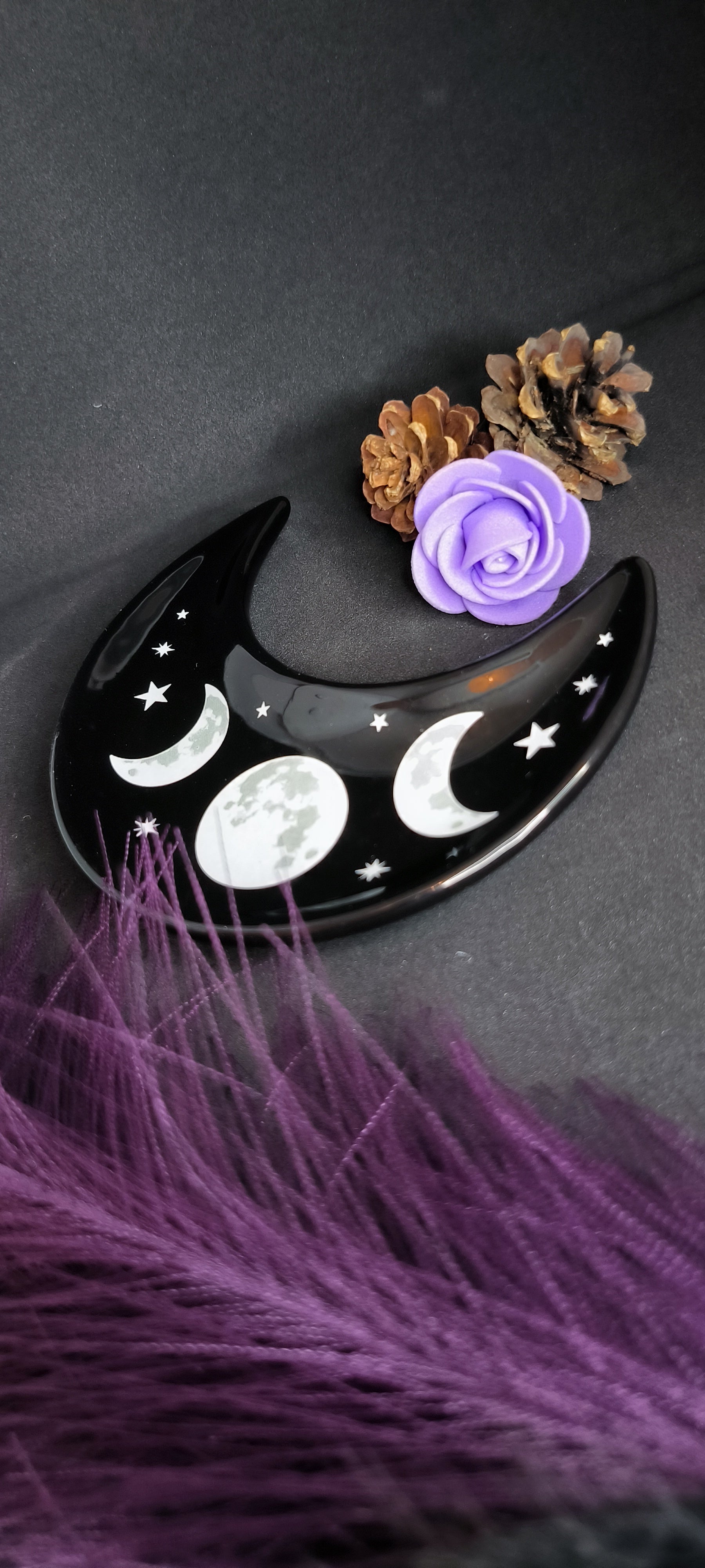 Vide-poches croissant de Lune noir avec un design contemporain triple Lune. Parfait pour ranger vos précieux petits bijoux tels que des bagues et des boucles d'oreilles, mais aussi vos pièces ou clefs de voitures, pour qu'ils ne traînent plus sur le buffet ! Dimensions du produit : H1.5 cm x L10 cm x P12 cm.