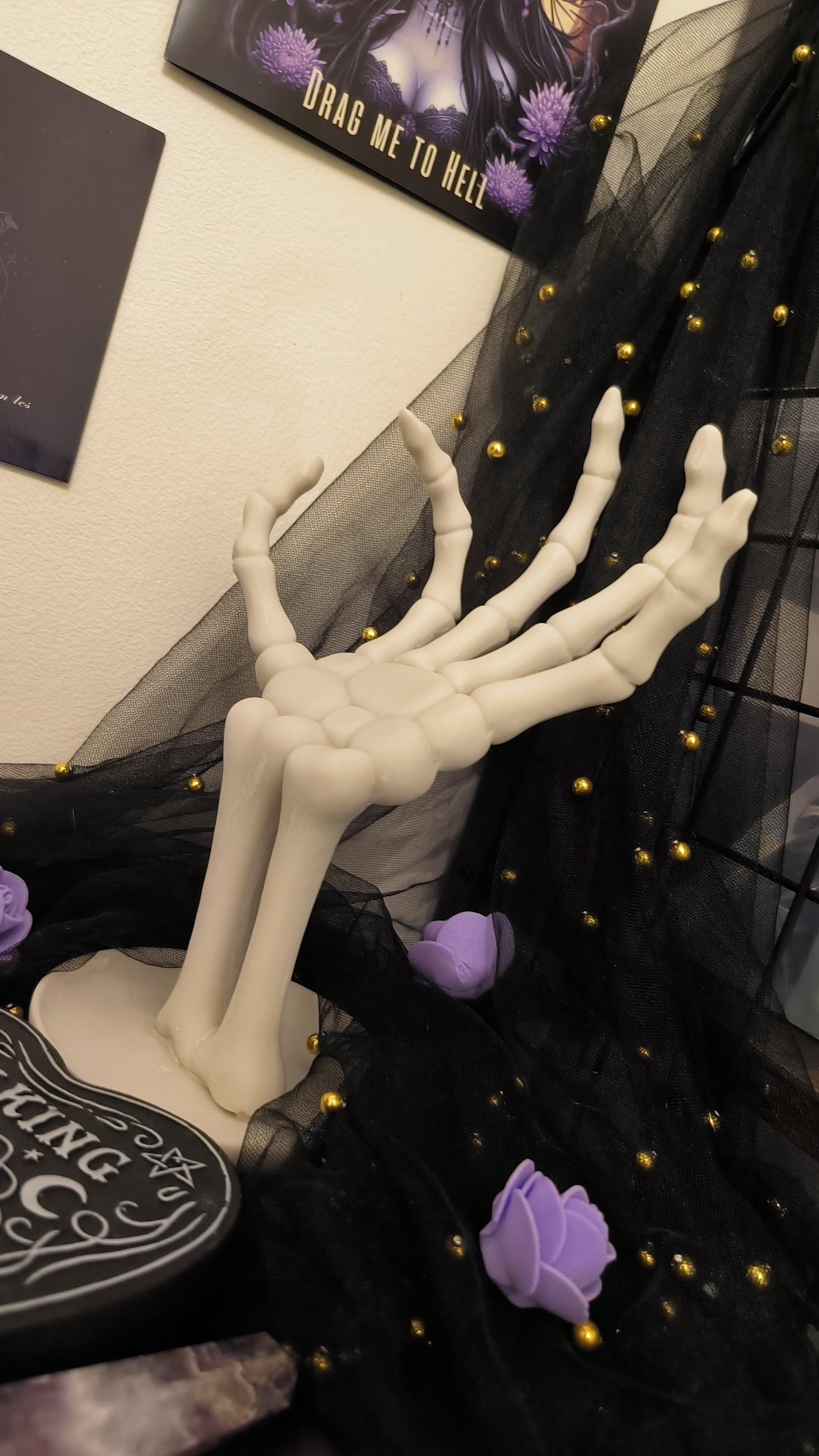 Cette main squelette réaliste s'acquittera de sa lourde tâche de tenir des bijoux et autres babioles avec une touche d'élégance étrange. Ses doigts légèrement recourbés sont parfaits pour tenir des bagues, des bracelets et des colliers, tandis que sa base sert d'espace supplémentaire pour ranger de précieux trésors.
